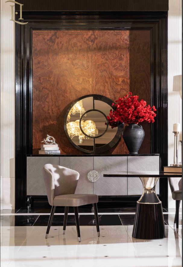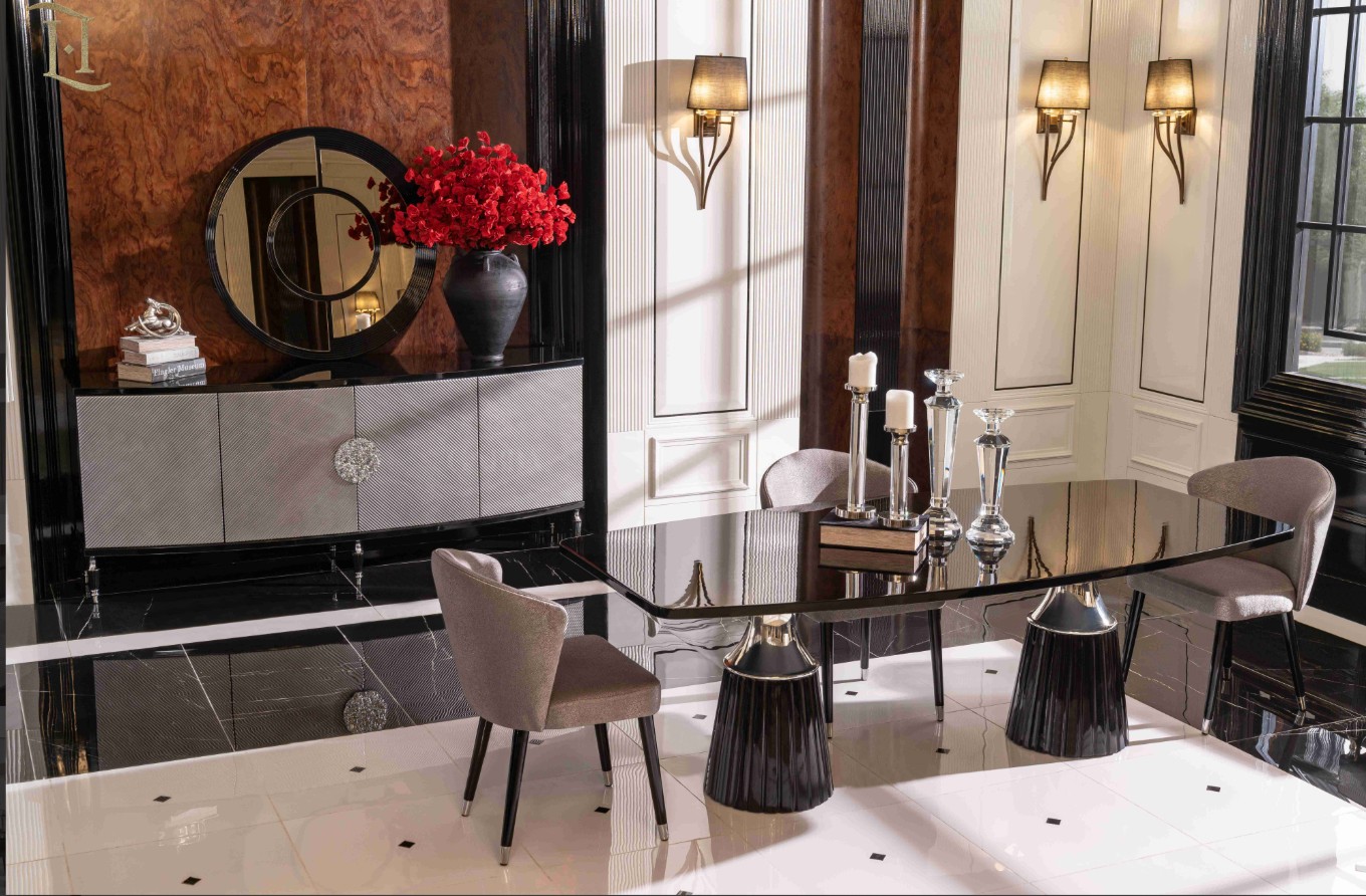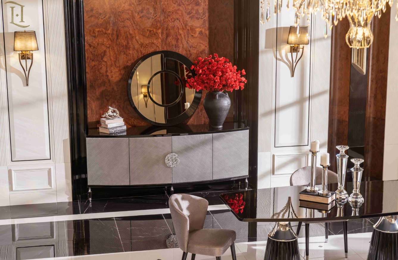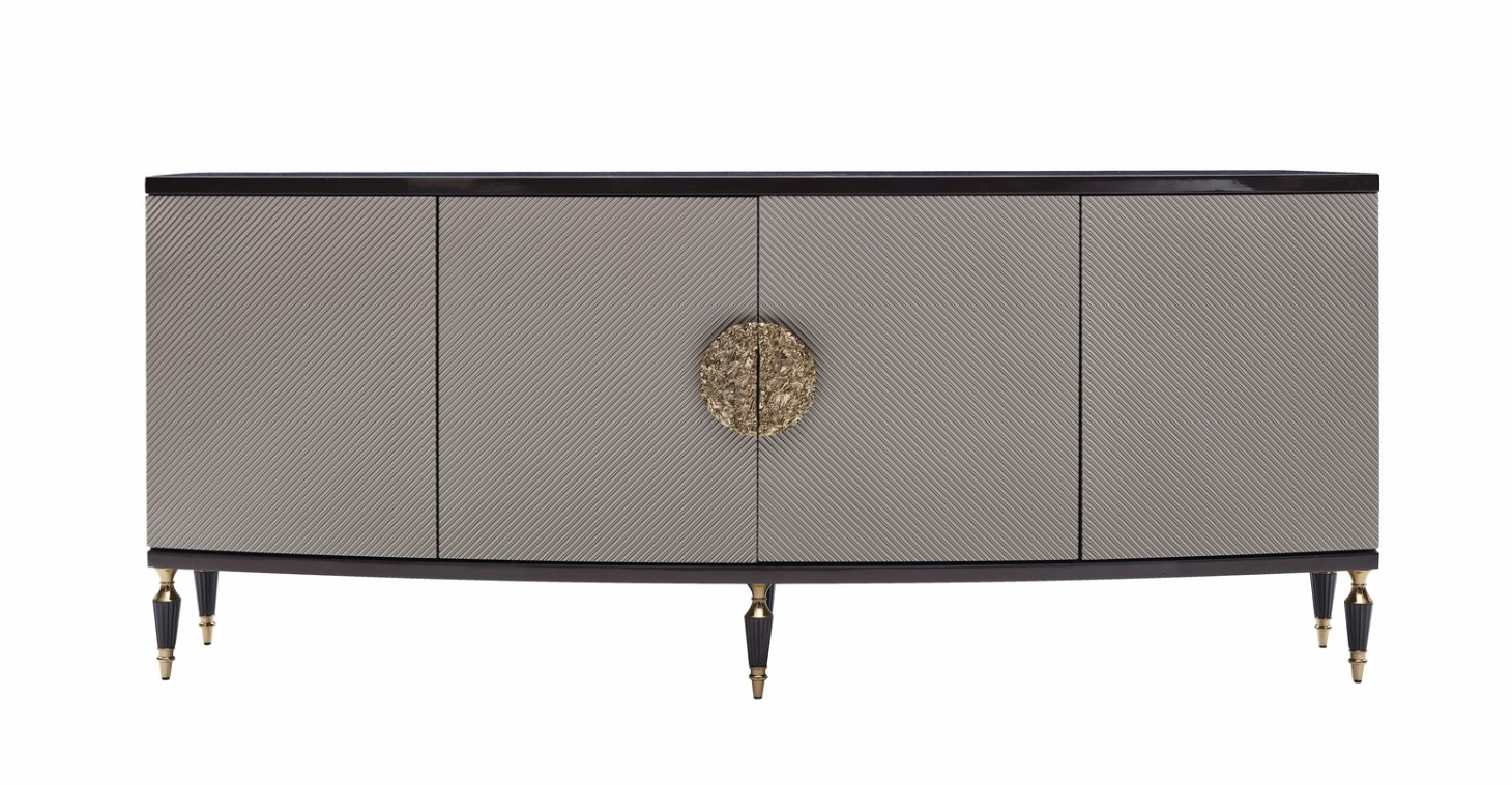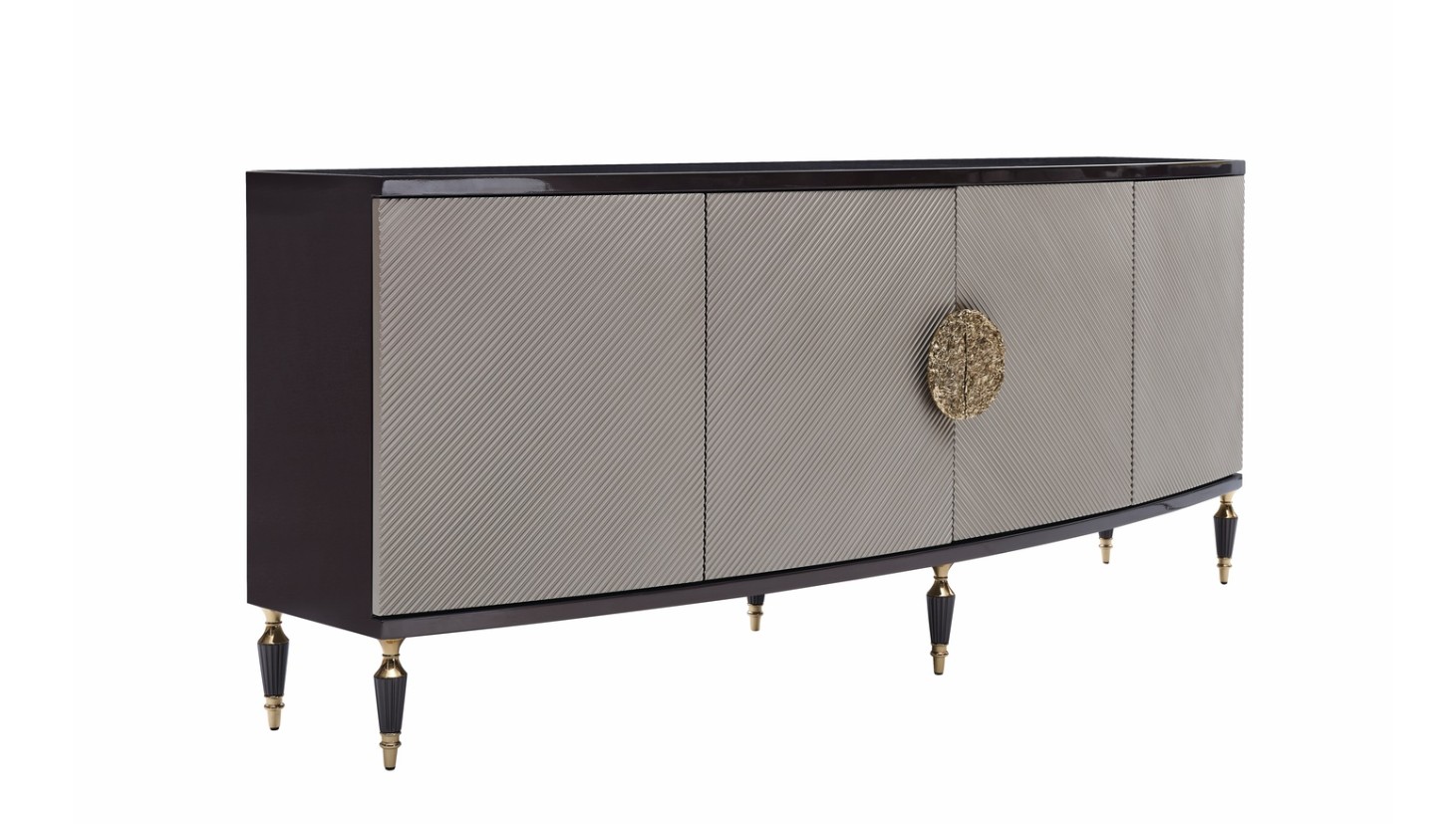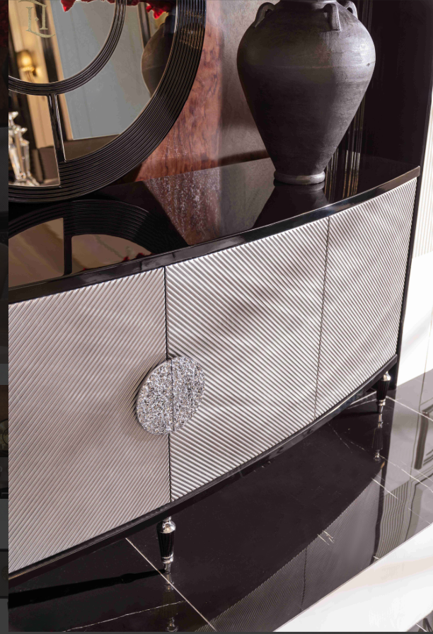 The Bespoke spaces Sideboard is a striking blend of elegance and modern design. Featuring a curved silhouette, it is available in two refined finishes: black/grey with chrome details or dark brown/cream with gold accents. The textured diagonal pattern on the doors adds depth, while the intricuate metal handles bring a luxurious touch. A high-gloss top enhances its sophisticated appeal, making it a statement piece for dining or living spaces.